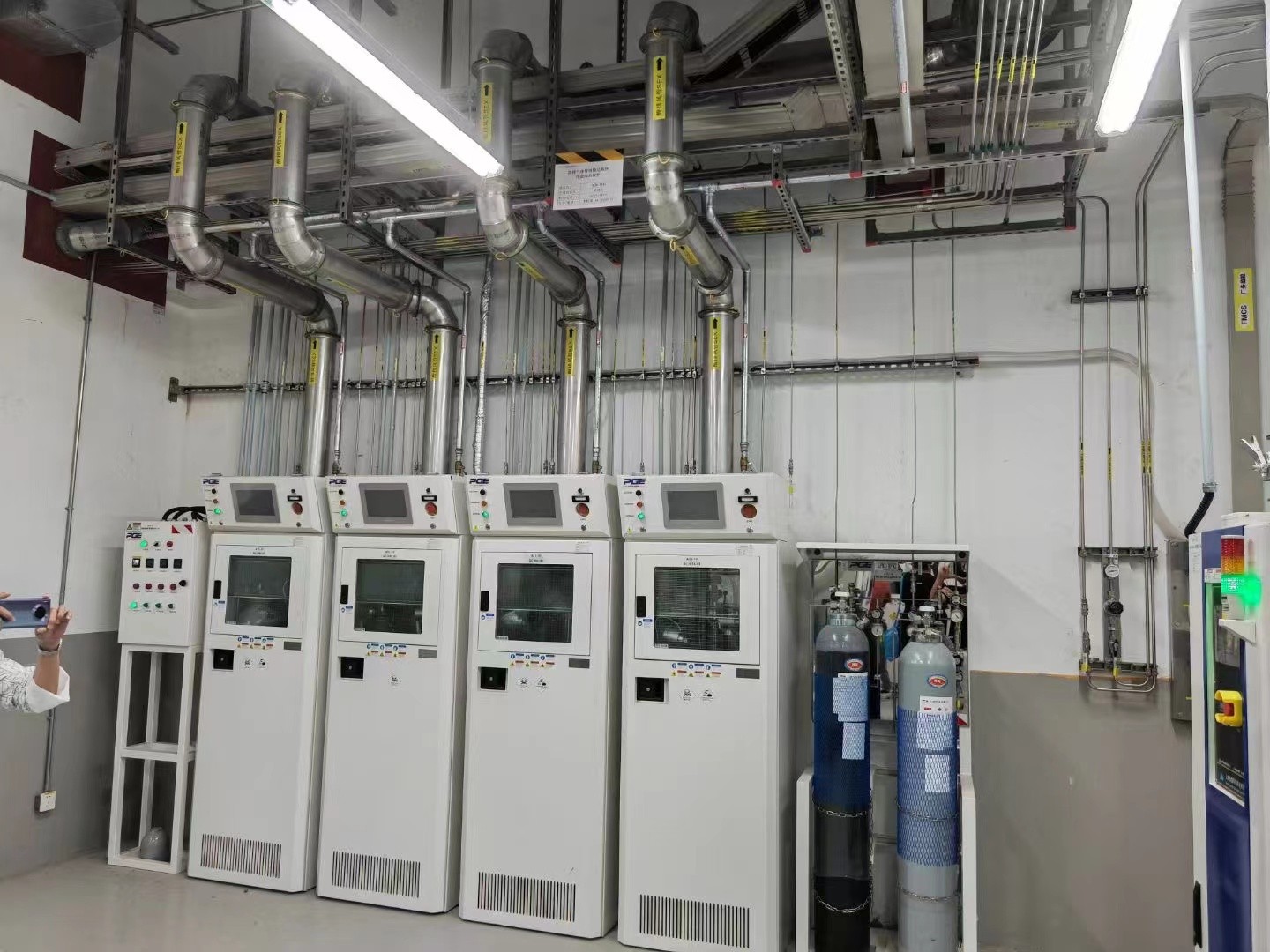 電子特氣管道系統,簡稱特氣系統由存儲、輸送、分配、控制四類組成,其中“存儲”是指氣源部分(特氣柜GC),“輸送”指配管方面(一般用雙套管),“分配”指二次配部分(氣體分配柜VMB),“控制”指監督控制部分(氣體管理系統GMS)。是一種廣泛應用于半導體、集成電路、光纖、太陽能電池等微電子行業的氣路系統。